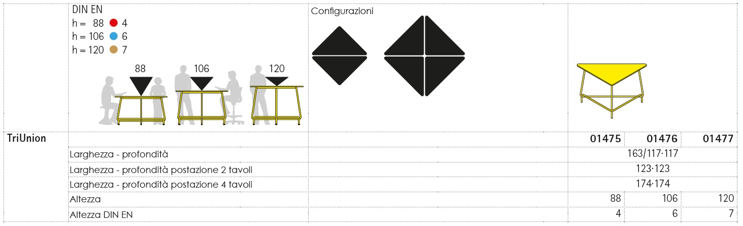 Tavolo multifunzionale, componibile, mobile. Ideale per attività di gruppo di tipo informale e per spazi che richiedono frequenti riconfigurazioni. Il tavolo TriUnion è caratterizzato da piano triangolare ampio e spazioso che consente l´aggregazione di più tavoli tra loro ampliando la superficie di lavoro disponibile; poggiapiedi che consente l´utilizzo confortevole del tavolo sia stando in piedi che seduti; design innovativo, il tavolo è stato realizzato con la collaborazione di pedagogisti ed esperti di ergonomia. Numerosi studi dimostrano che lavorare in piedi aiuta a rimanere concentrati. La particolare altezza del tavolo (cm 88 / cm 106 / cm 120) favorisce inoltre la collaborazione tra giovani e adulti. Tabella completa dimensioni e misure nell´immagine sottostante