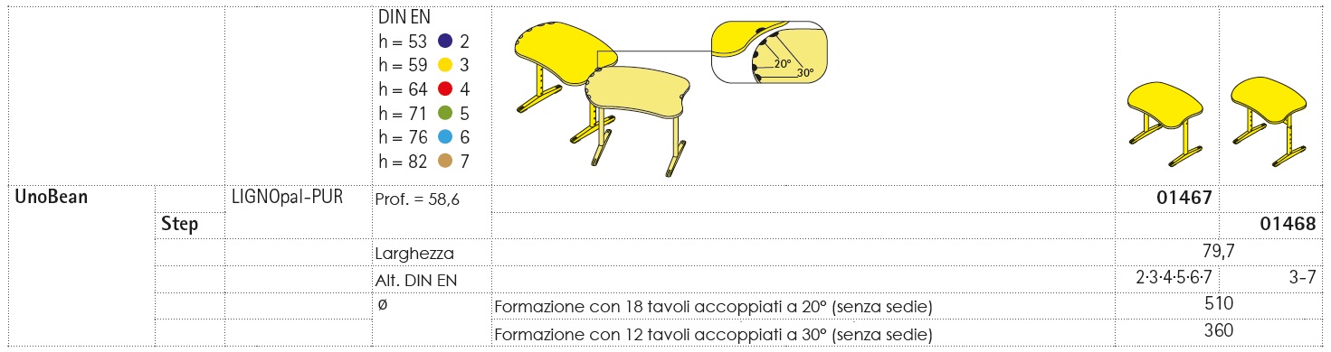 Il banco per alunni UnoBean-Step è caratterizzato da un piano sagomato dalla forma innovativa e può essere accostato ad elementi simili per creare configurazioni particolari che un piano tradizionale non permetterebbe d´ottenere ed è regolabile in altezza.