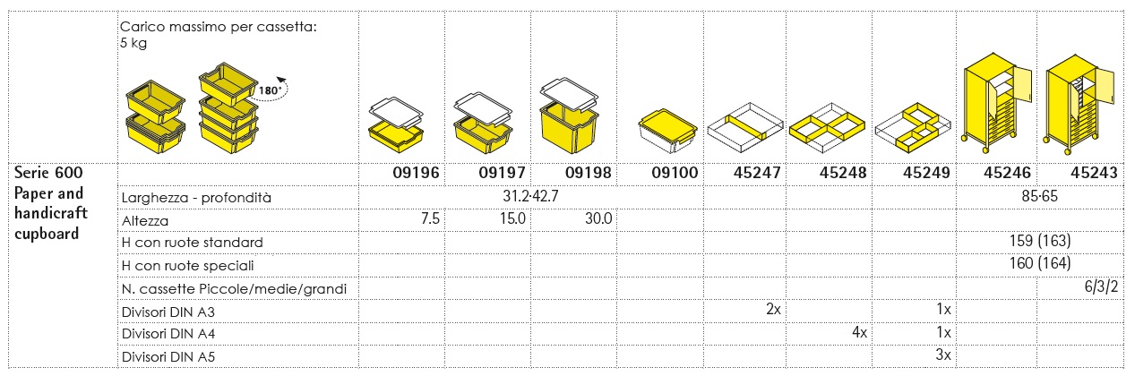 I mobili portacartoncini della Serie 600 permettono un´organizzazione ottimale del materiale didattico. Facilmente trasportabili grazie alle ruote piroettanti di cui sono dotati, i carrelli possono essere attrezzati con numerosi accessori. Ampia gamma di colori a scelta.