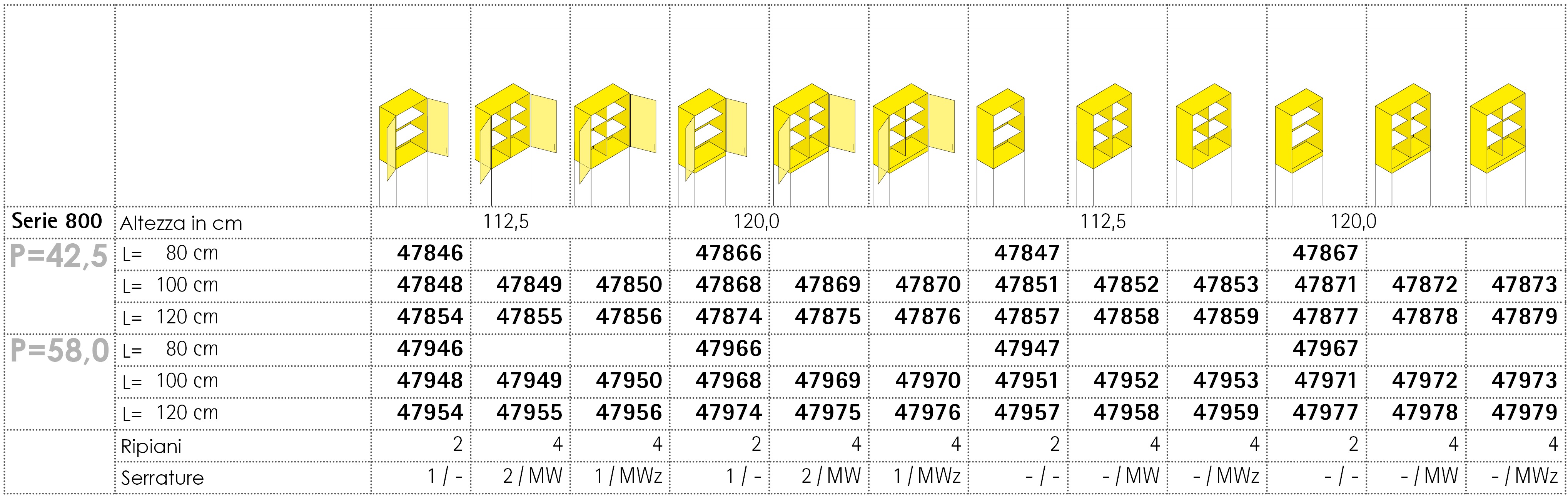 I sopralzi della Serie 800 sono disponibili in un´ampia gamma di dimensioni, soluzioni di partizione interna e in numerose varianti di colori finiture. Possono essere dotati di un numero variabile di ripiani interni, a seconda della necessità, realizzabili in numerosi materiali e colori. I sopralzi completi di ante sono dotati di cerniere speciali con apertura a 270 gradi, chiudibili con serratura separatamente o in coppia, e possono essere personalizzati con numerose tipologie di maniglie diverse per colori e materiali.