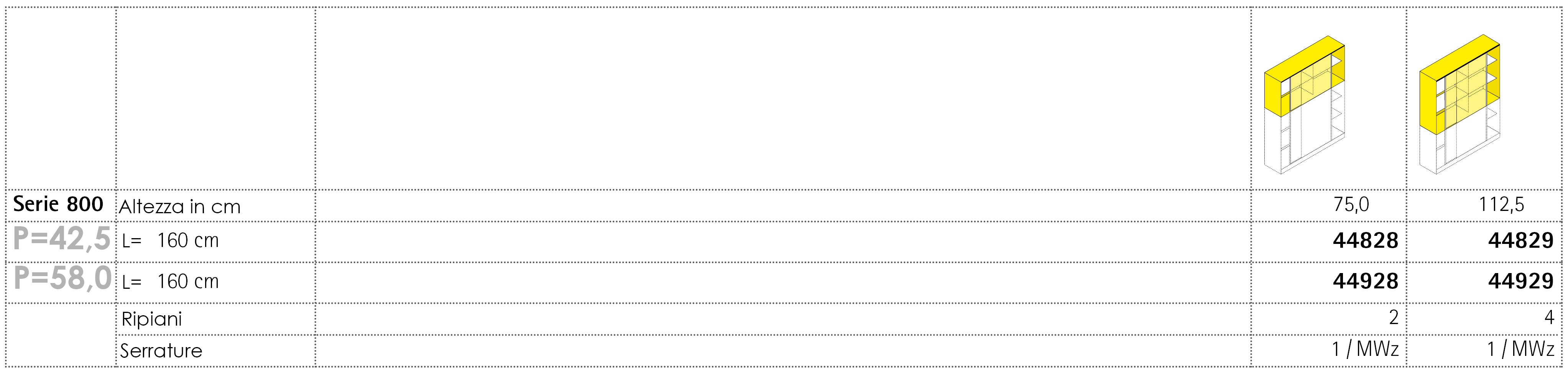 I sopralzi della Serie 800 sono disponibili in un´ampia gamma di dimensioni, soluzioni di partizione interna e in numerose varianti di colori finiture. Possono essere dotati di un numero variabile di ripiani interni, a seconda della necessità, realizzabili in numerosi materiali e colori. I sopralzi completi di ante sono dotati di cerniere speciali con apertura a 270 gradi, chiudibili con serratura separatamente o in coppia, e possono essere personalizzati con numerose tipologie di maniglie diverse per colori e materiali.