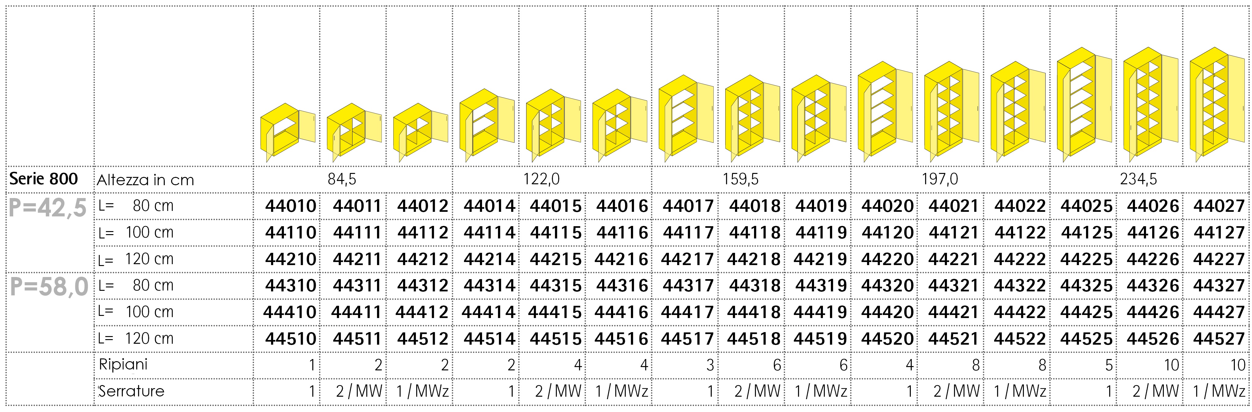 Gli armadi della Serie 800 sono disponibili in numerose dimensioni e con una vasta gamma di soluzioni di partizione interna. Gli armadi, grazie alla modularità dei vari elementi tra loro, permettono la creazione di armadiature di dimensioni variabili e possono essere attrezzati per soddisfare ogni tipo di esigenza. Le ante, complete di cerniere speciali con apertura a 270 gradi, possono essere dotate di serratura con chiave universale o con chiave di sicurezza e con apertura a destra o a sinistra. Tutte le armadiature della Serie 800, in una vasta gamma di colori e finiture a scelta, possono essere personalizzate con un numero variabile di ripiani in diversi colori e materiali e con numerose tipologie di maniglie.