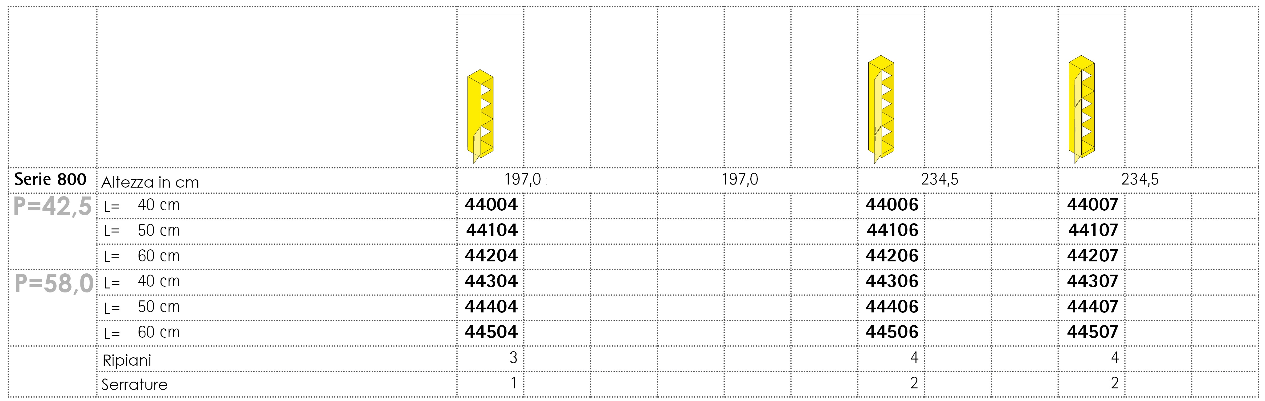Gli armadi della Serie 800 sono disponibili: con parte inferiore chiusa da anta e parte superiore a giorno oppure chiusi da due ante a battente. Il numero dei ripiani, in diversi materiali e colori, può variare a seconda delle necessità; le ante, dotate di cerniere speciali con apertura a 270 gradi, possono essere predisposte con apertura a destra o a sinistra e sono disponibili con o senza serratura completa di chiave universale o chiave di sicurezza. Gli armadi sono personalizzabili grazie ad una vasta gamma di colori e finiture a scelta e di diverse tipologie di maniglie. Gli armadi della Serie 800 sono accostabili ad altri elementi e rendono possibile la creazione di armadiature diverse per tipologia e utilizzo ma perfettamente in sintonia tra loro.
