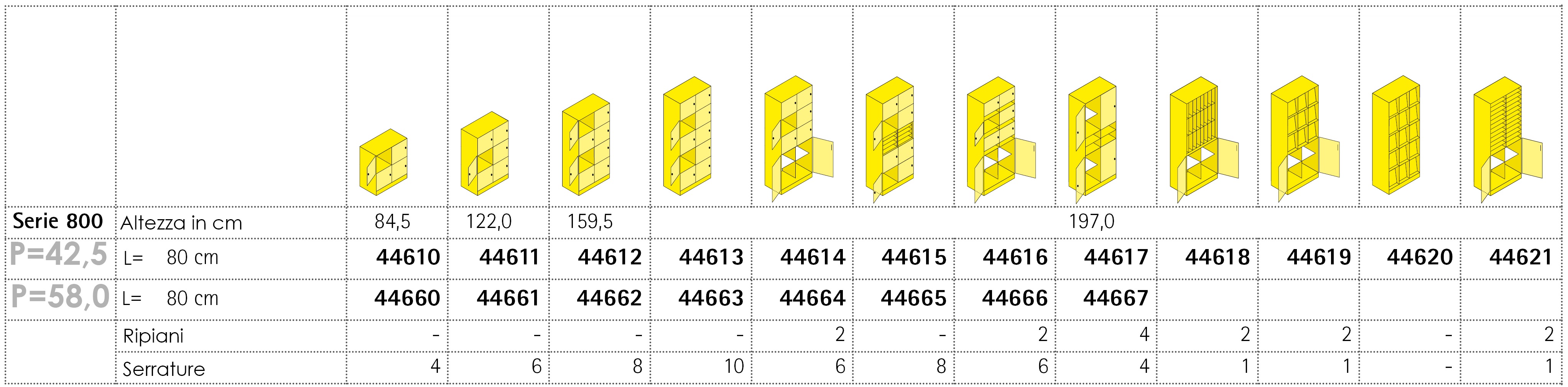 Gli armadi casellari della Serie 800 sono stati pensati per riporre ordinatamente e in sicurezza materiali individuali di insegnanti o alunni e permettere numerose personalizzazioni, a seconda del loro utilizzo. I casellari sono disponibili nelle versioni: a quattro, a sei, a otto, a dieci posti. I vani sono dotati di anta, predisposta con apertura a destra o a sinistra, dotabile di serratura con chiave universale o personale e sono completi di targhetta portanome o targhetta portanumero. Tutte le ante sono complete di cerniera speciale con apertura a 270 gradi. I casellari sono disponibili anche con vano ad anta e ripiani interni, con casellario a giorno e con espositore portariviste. Gli armadi casellari della Serie 800, in un´ampia gamma di colori e finiture, sono perfettamente accostabili ad altri elementi per la creazione di armadiature di dimensioni variabili e dalle diverse funzioni.