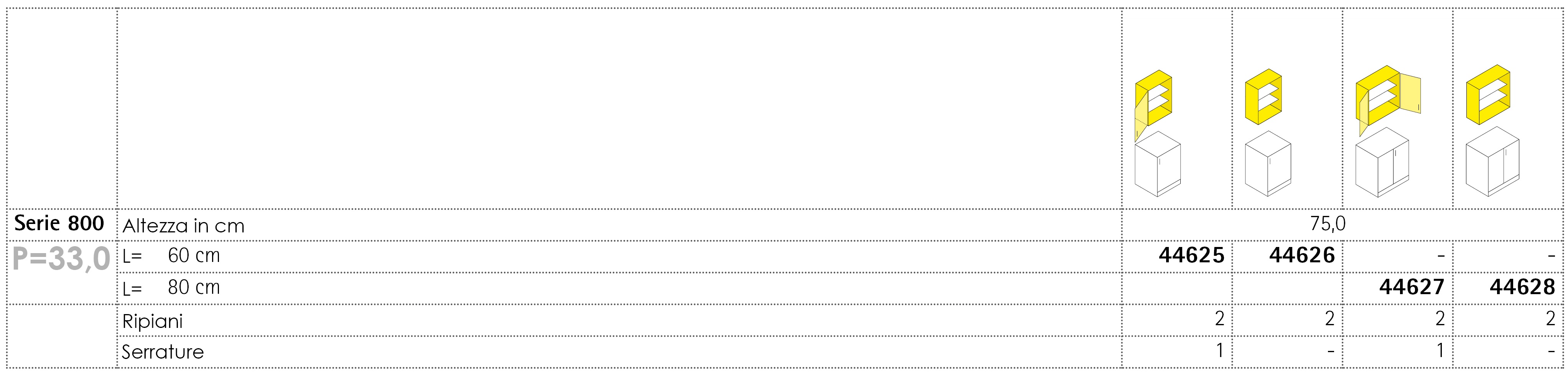 I pensili della Serie 800 sono disponibili in un´ampia gamma di dimensioni, soluzioni di partizione interna e in numerose varianti di colori finiture. I pensili possono essere dotati di un numero variabile di ripiani interni, a seconda della necessità, realizzabili in numerosi materiali e colori. I pensili completi di ante sono dotati di cerniere speciali con apertura a 270 gradi, chiudibili con serratura separatamente o in coppia, e possono essere personalizzati con numerose tipologie di maniglie diverse per colori e materiali.