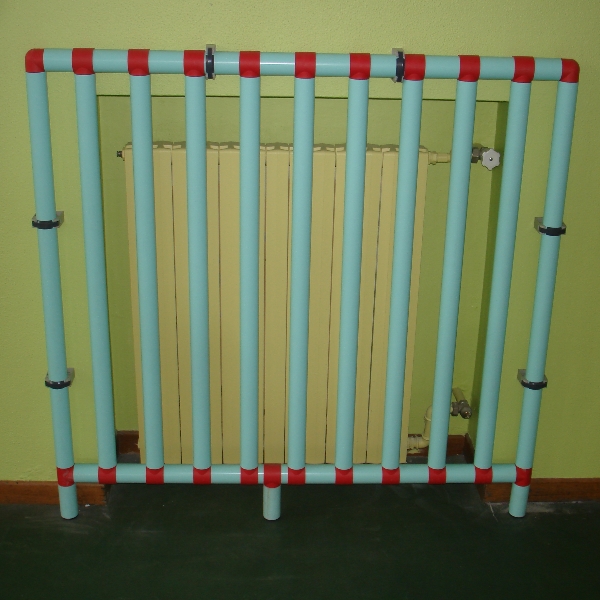 Protezione di sicurezza per radiatori e termoconvettori, realizzata in PVC ignifugo cl. 1 ed atossico. Tutto il tubo diam. 50 mm. presenta un´anima di rinforzo interna spessore 1 mm. che garantisce una maggiore resistenza e stabilità alla protezione. La distanza tra i tubi verticali è pari a 8 cm., migliorativa rispetto alla normativa UNI 10809 3.3 sull´inattraversabilità delle protezioni, e garantisce comunque il passaggio del calore prodotto dal radiatore.