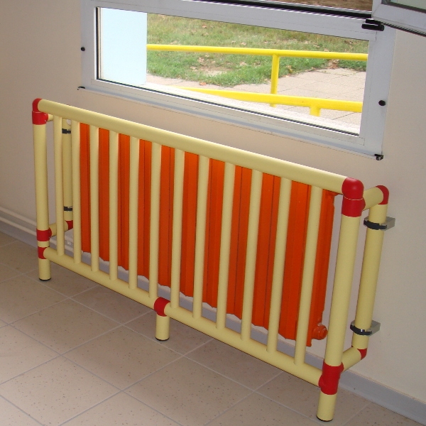 Protezione di sicurezza per radiatori e termoconvettori, realizzata in PVC ignifugo cl. 1 ed atossico. Tutto il tubo diam. 50 mm. presenta un´anima di rinforzo interna spessore 1 mm. che garantisce una maggiore resistenza e stabilità alla protezione. La distanza tra i tubi verticali è pari a 5 cm., migliorativa rispetto alla normativa UNI 10809 3.3 sull´inattraversabilità delle protezioni, e garantisce comunque il passaggio del calore prodotto dal radiatore.