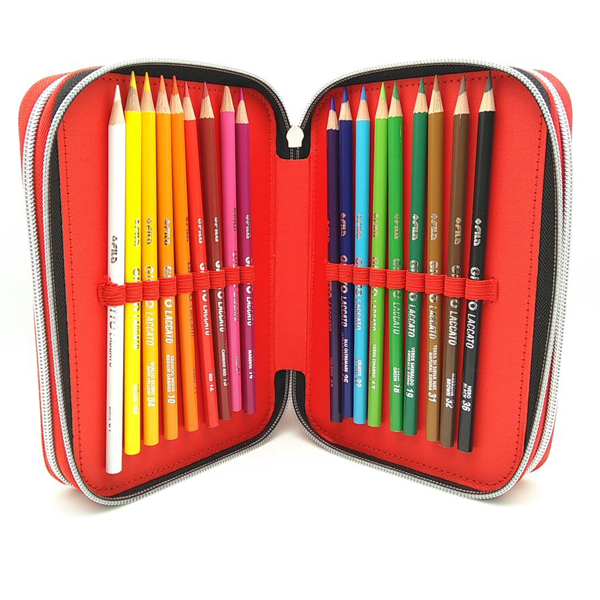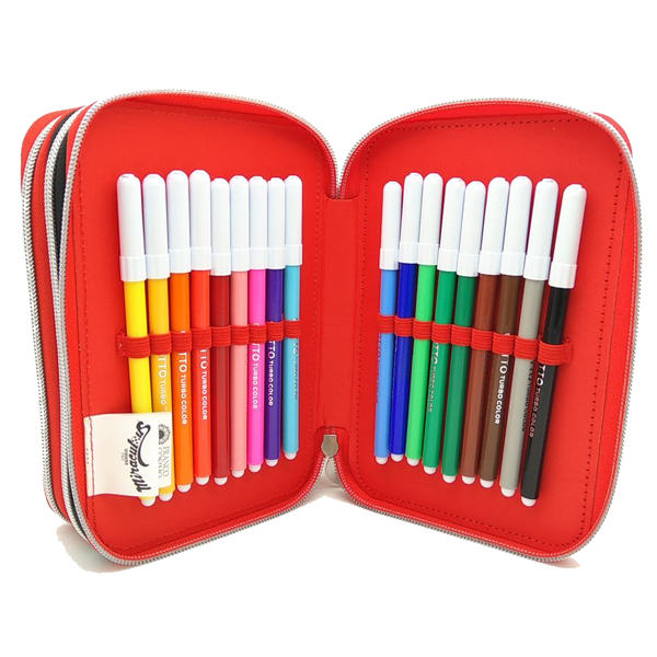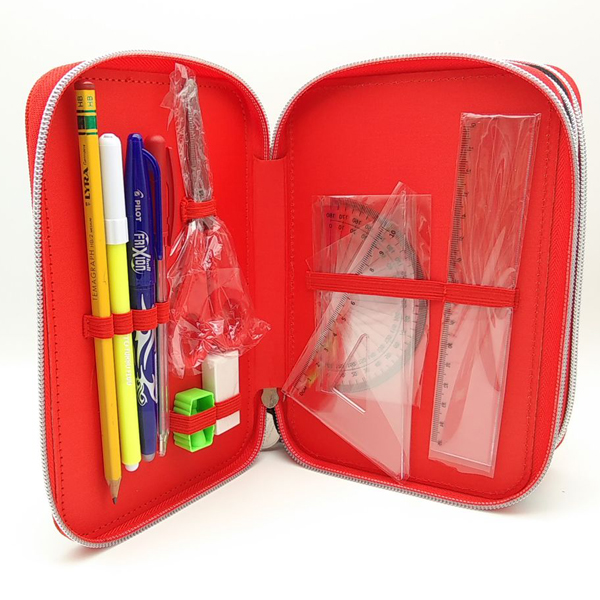 L´astuccio 3 zip pieno Miraculous è un astuccio pratico, resistente e ideale per la scuola elementare. All´interno tutto resta al posto giusto grazie agli elastici e con i 3 scomparti chiusi dalle zip tutto è a portata di mano. L´astuccio 3 zip pieno Miraculous contiene 18 matite e 18 pennarelli colorati, 1 temperamatite a 1 foro, 1 gomma bianca, 1 forbice con maniglie in plastica,1 penna a sfera rossa, 1 penna Pilot Frixion blu, 1 matita HB, 1 righello, 1 goniometro e 1 squadra trasparenti. Dimensione: cm 13x19.5x7h.