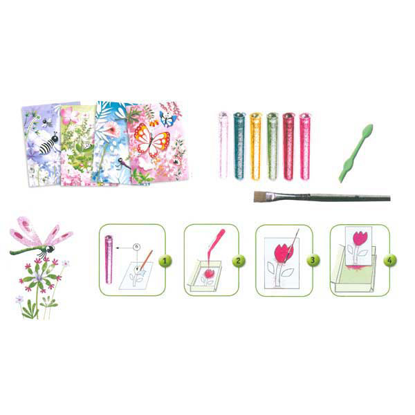 Il comodo cofanetto Art Djeco Farfalle brillanti contiene 4 basi, raffiguranti farfalle e insetti vari, con aree removibili con colla per far aderire i brillantini in diverse zone. Il kit Art Djeco contiene 4 basi per i quadretti, 6 tubetti di brillantini di colori diversi, una spatola e un pennello. Da 7 a 13 anni.