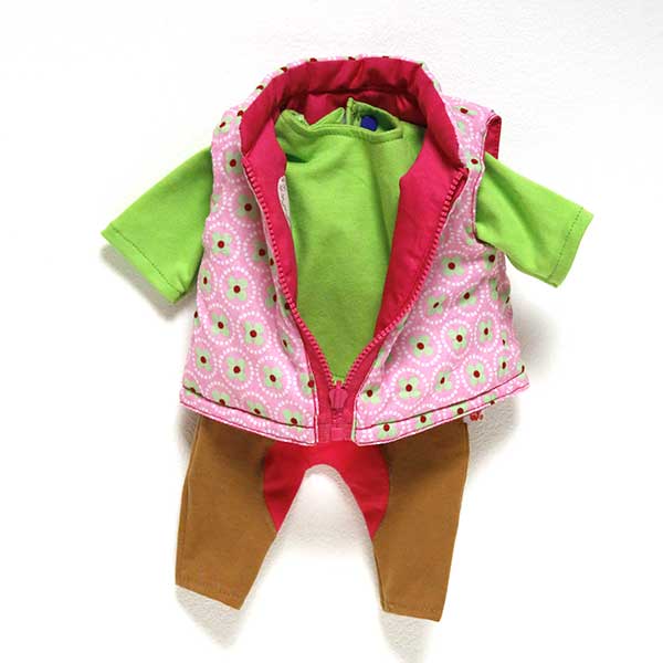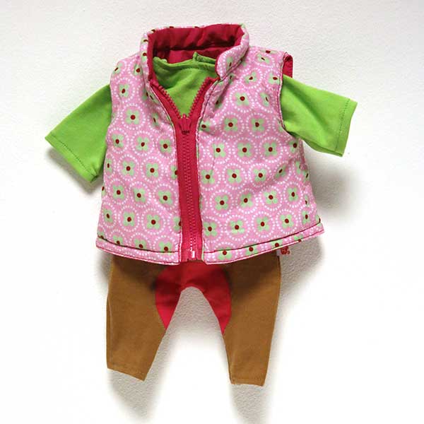 Il vestito equitazione con gilet è ideale per bambole da 35 a 45 cm. Il vestito equitazione con gilet Heless è un completo composto da gilet reversibile, fuxia e fantasia a fiori, maglietta verde chiaro e pantaloni marroni con cavallo rosa. Il vestito equitazione con gilet è made in Germany.