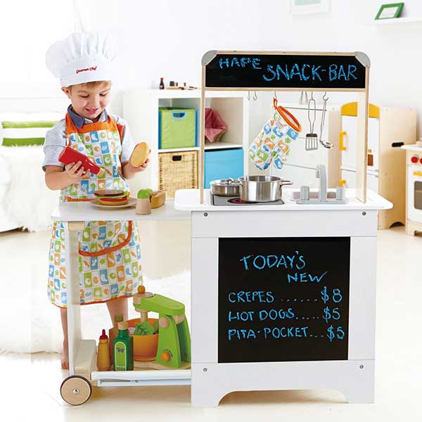 La cucina con carrello di Hape ha tutto lo spazio che occorre ad un piccolo chef per cucinare ricette deliziose. La cucina di Hape è dinamica, in un attimo il piano lavoro viene ampliato grazie al carrello con ruote estraibile, completo inoltre di un´ampia lavagna ideale per scrivere il menù e di un scaffale con ganci per gli utensili. La cucina con carrello di Hape è completo di due fornelli, lavandino e ampio forno con manopole mobili.