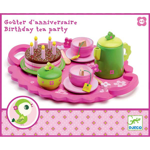 Festeggia il compleanno con una fetta di torta e un tè. Il Tea Birthday party Djeco è tutto in legno, contiene un ampio vassoio, 2 tazzine, bustine del tè, cucchiaini, teiera e zuccheriera tutte sulle tonalità del rosa e del verde e una torta di compleanno tagliata a fette con le candeline. Da 4 anni.