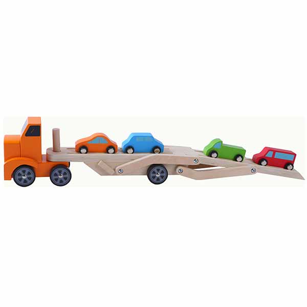 Il camion bisarca in legno è un camion a due livelli con rimorchio staccabile e già 4 auto incluse nella confezione. Il camion bisarca di Atelier du Bois ha il livello superiore del rimorchio che può essere abbassato e alzato a piacere per far scendere le macchine. Il camion bisarca in legno misura 31x7x17 cm. Da 2 anni.