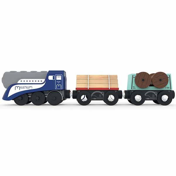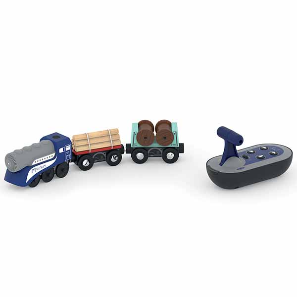 Il treno merci radiocomandato ha effetti sonori e luminosi ed è compreso di locomotiva radiocomandata e 2 vagoni merci. Il treno merci raciocomandato di Atelier du Bois viene manovrato tramite un telecomando multiuso con bottoni e leva. Il treno merci radiocomandato ha un sistema a calamite tra i vagoni. Da 3 anni.